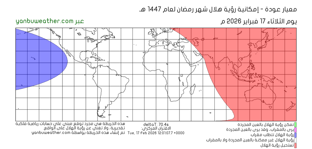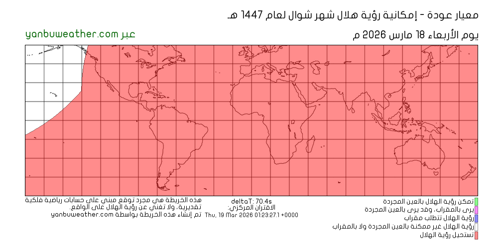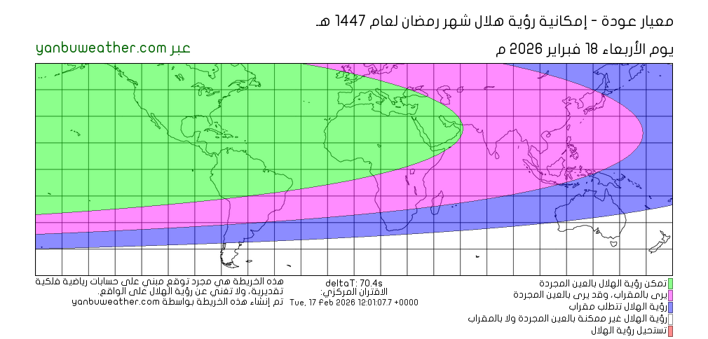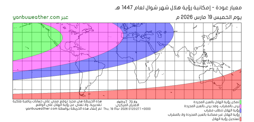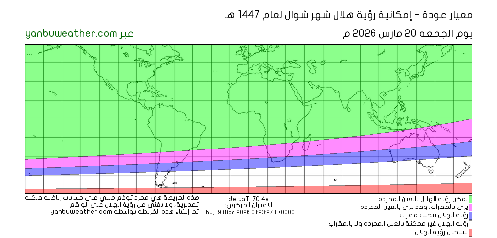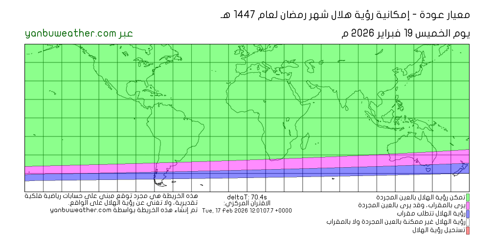 يرجى ملاحظة أن الخريطة تبين إمكانية رؤية الهلال في المناطق الواقعة بين دائرتي عرض 60° شمالا و60° جنوبا.